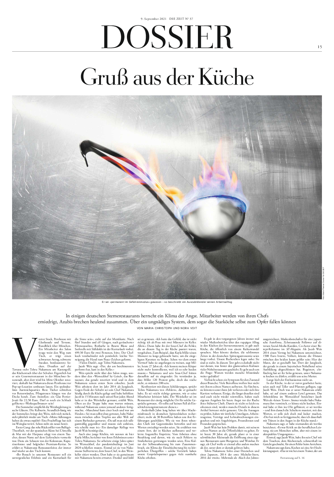 Tohru Nakamura: Sohn einer Deutschen und eines Japaners, 2014 der erste Michelin-Stern, 2016 der zweite. Mehrmals als »Koch des Jahres« ausgezeichnet, Markenbotschafter für eine japanische Autofirma, Zehntausende Follower auf diversen Social-Media-Kanälen, Co-Autor einer Rezept-Kolumne im SZ-Magazin. Als Jacob Weis 2014 einen Vertrag bei Nakamura unterzeichnet, 1500 Euro brutto, Vollzeit, könnte die Distanz zwischen den beiden kaum größer sein: Hier der Mann, der es geschafft hat. Dort der Jungkoch, der gerade in einem bayerischen Nobelhotel seine Ausbildung abgeschlossen hat. Begeistert, ehrfürchtig fast sei ihr Sohn gewesen, unter Nakamura kochen zu dürfen, erzählt uns seine Mutter.