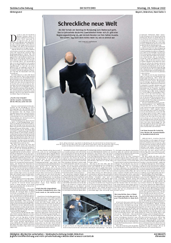„Die Welt danach ist nicht mehr dieselbe wie die Welt davor“, sagt Scholz also. Nicht viel länger als eine halbe Stunde wird er sprechen. Er wird die Stimme kaum erheben in diesen Minuten, seine Hände liegen meist auf dem Pult. In dieser Hinsicht bleibt Scholz Scholz.