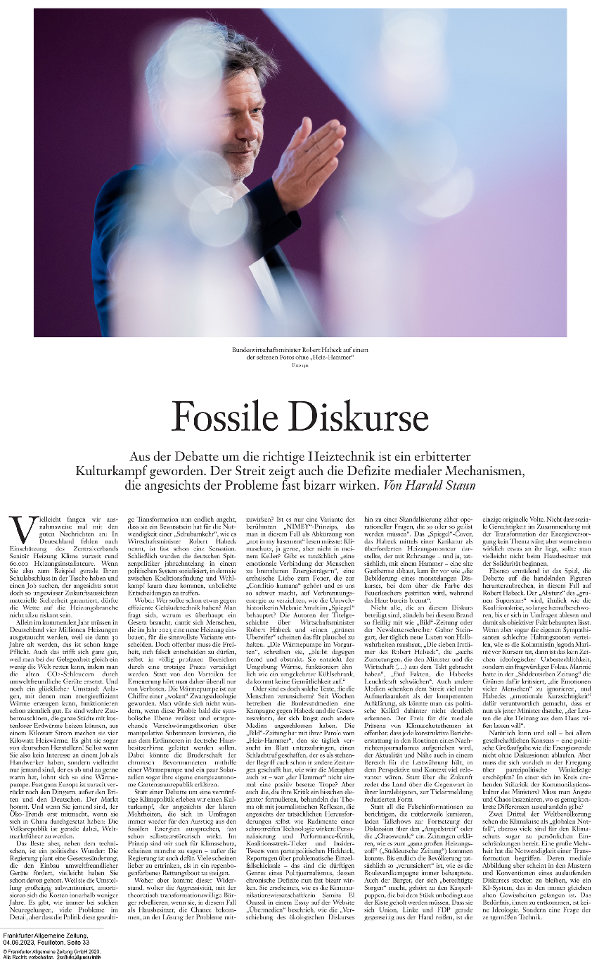 Woher aber kommt dieser Widerstand, woher die Aggressivität, mit der theoretisch transformationswillige Bürger rebellieren, wenn sie, in diesem Fall als Hausbesitzer, die Chance bekommen, an der Lösung der Probleme mitzuwirken? Ist es nur eine Variante des berühmten "NIMBY"-Prinzips, das man in diesem Fall als Abkürzung von "not in my basement" lesen müsste: Klimaschutz, ja gerne, aber nicht in meinem Keller? Gibt es tatsächlich "eine emotionale Verbindung der Menschen zu brennbaren Energieträgern", eine archaische Liebe zum Feuer, die zur "Conditio humana" gehört und es uns so schwer macht, auf Verbrennungsenergie zu verzichten, wie die Umwelthistorikerin Melanie Arndt im "Spiegel" behauptet? Die Autoren der Titelgeschichte über Wirtschaftsminister Robert Habeck und seinen "grünen Übereifer" scheinen das für plausibel zu halten. "Die Wärmepumpe im Vorgarten", schreiben sie, "bleibt dagegen fremd und abstrakt. Sie entzieht der Umgebung Wärme, funktioniert ähnlich wie ein umgekehrter Kühlschrank, da kommt keine Gemütlichkeit auf."