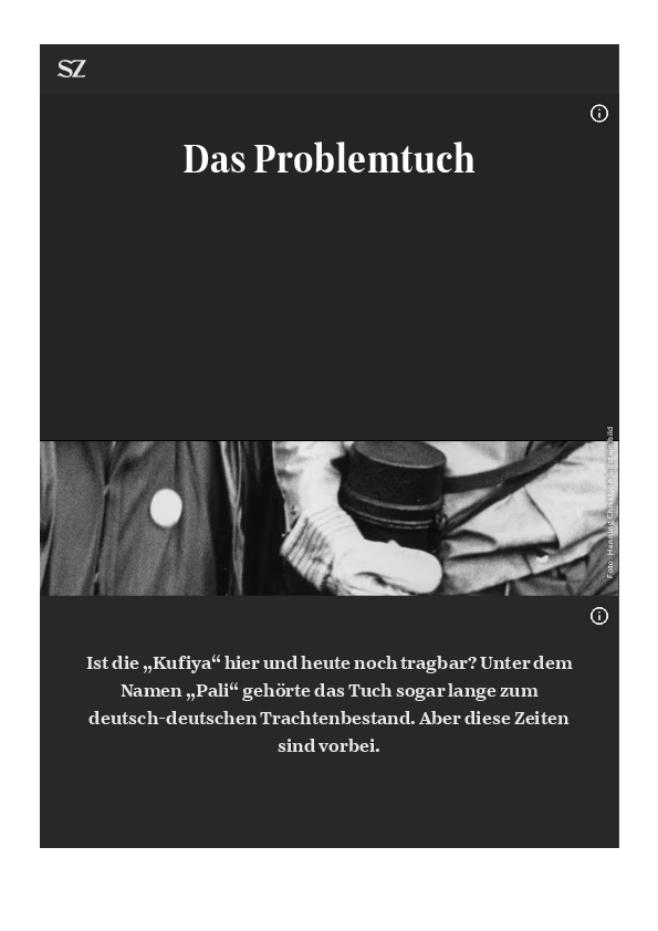 Bemerkenswert, dass es dem Tuch im Westen ähnlich erging. Wolfgang Kraushaar zufolge waren es die Abgesandten des Palästinakomitees des SDS, die es Ende der Sechziger mitbrachten. Oft ist beschrieben worden, wie da eine traditionelle Kopfbedeckung arabischer Männer, die vor allem auf dem Land vor Sonne, Wind und Sand schützen sollte, in der Bundesrepublik allmählich zum wärmenden Schal im Nieselregen bei den Protesten gegen Atommeiler und die Räumung besetzter Häuser wurde. Wie das P-Tuch also schleichend eingedeutscht wurde. Denn das Tuch war wirklich warm, und bei Bedarf konnte man sich damit vermummen. Das Vermummungsverbot, das Mitte der Achtziger erlassen worden war, umfasste auch das Mitführen von „Vermummungsutensilien“, Motorradmasken etwa, Hassmasken genannt, wie sie bei den frühen Autonomen beliebt waren. Gegen palästinensische Schals konnten deutsche Behörden schlecht vorgehen. Die damit zur Schau gestellte Solidarität mit der Sache der PLO wirkte dadurch aber nur noch taktischer, noch scheinbarer. Die Intifada-Ästhetik wurde für eher deutsche Zusammenhänge bemüht.