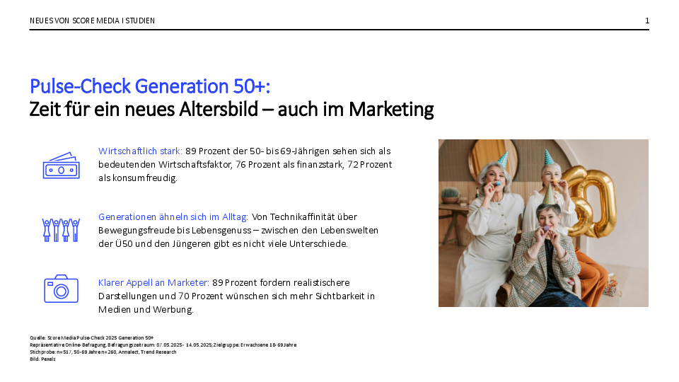 Sie sind fit, konsumfreudig und technikaffin – die Generation 50+ bricht mit alten Klischees. Das zeigt eine neue Befragung der Score Media Group, die ein deutliches Signal an Werbung und Medien sendet: Die Zielgruppe wünscht sich mehr Sichtbarkeit, mehr Wertschätzung und ein neues Altersbild.